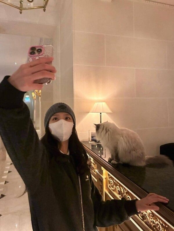 이어 마스크를 쓰고 고양이와 함께 찍은 셀카도 공개됐다. 자유분방한 분위기 속에서도 가려지지 않는 지수의 또렷한 이목구비와 독보적인 아우라가 돋보였다.