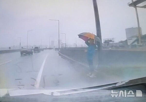 "강변북로 일산 방향으로 주행 중인데 할아버지가 우산을 쓰고 역방향으로 걸어가고 있어요."