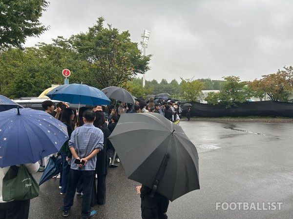 축구팬들은 훈련이 진행되는 보조경기장 근처에 모여 선수들을 기다렸다. 부슬비가 내렸지만 축구팬들의 열정을 막지는 못했다. 사인을 받기 위한 유니폼 등을 한손에 들고, 다른 손으로는 우산을 받쳐든 축구팬들이 진행요원들의 안내에 따라 한 블록을 이뤘다.