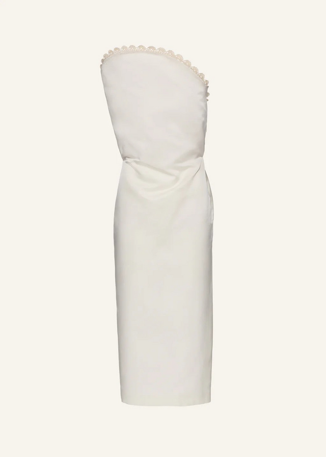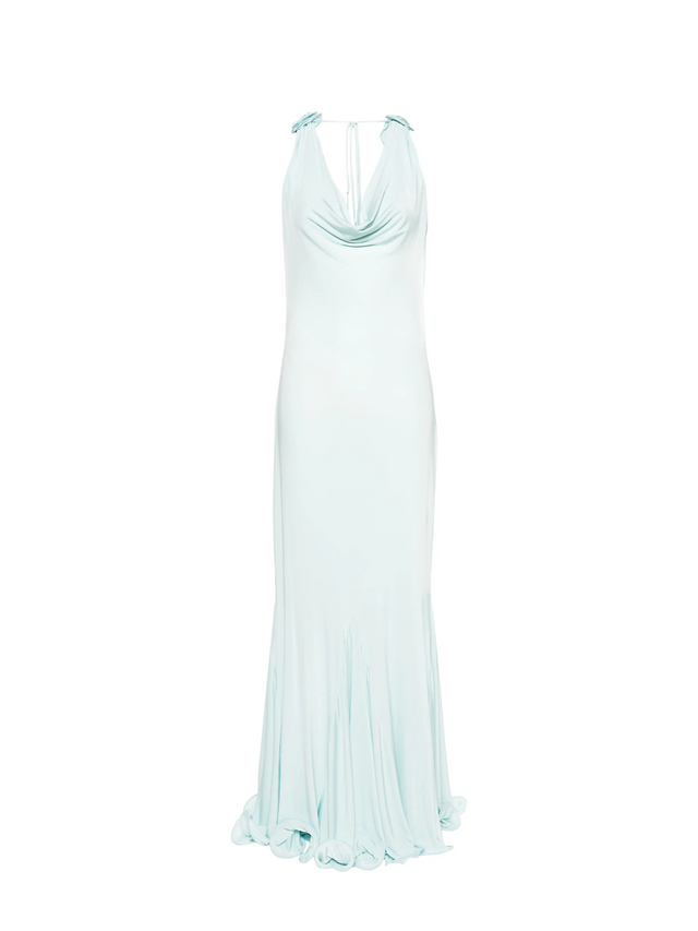 2부에서는 흘러내리는 실루엣이 매력적인 하늘색 슬립 드레스로 분위기를 바꿨다. 플레어 디테일과 곳곳에 더해진 셔링이 마그다 부트림 특유의 로맨틱한 무드를 완성했고, 가벼운 실크 소재가 자연스러운 움직임을 따라 은은하게 빛났다.