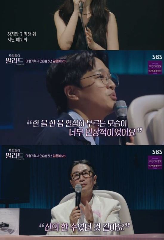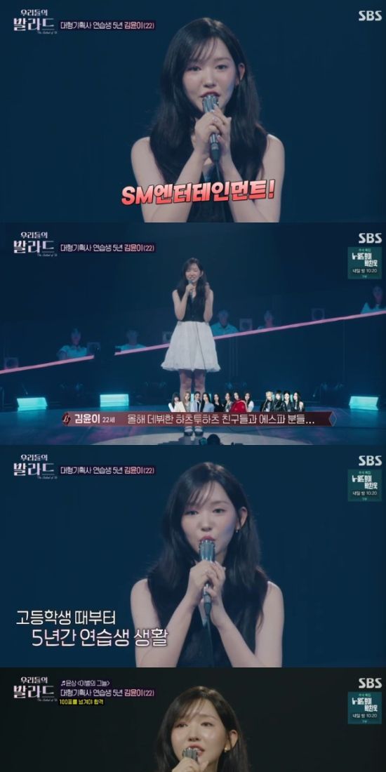 또 SM 엔터테인먼트에서 5년간 아이돌 연습생을 했다는 22세 김윤이도 무대에 올랐다. 김윤이는 "유튜브에 발라드를 부르는 영상을 올렸는데, 그걸 보고 SM에서 먼저 연락이 왔었다"고 말했다.