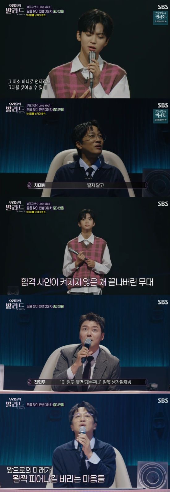 7일 방송된 SBS 예능 프로그램 '우리들의 발라드' 3회에서는 '탑백귀' 대표 전현무, 정재형, 추성훈, 차태현, 박경림, 대니 구, 크러쉬, 미미, 정승환이 출연해 참가자들의 무대를 보며 이야기를 나눴다.