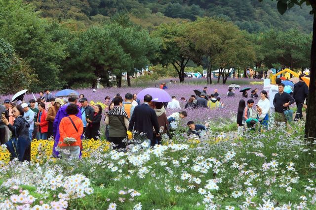 지난 7일 오후 강원 인제군 북면 용대리 일원에서 열린 '2025 인제 가을꽃 축제'를 찾은 관광객들이 우산을 쓰고 꽃길을 걷고 있다. / 인제군=뉴스1