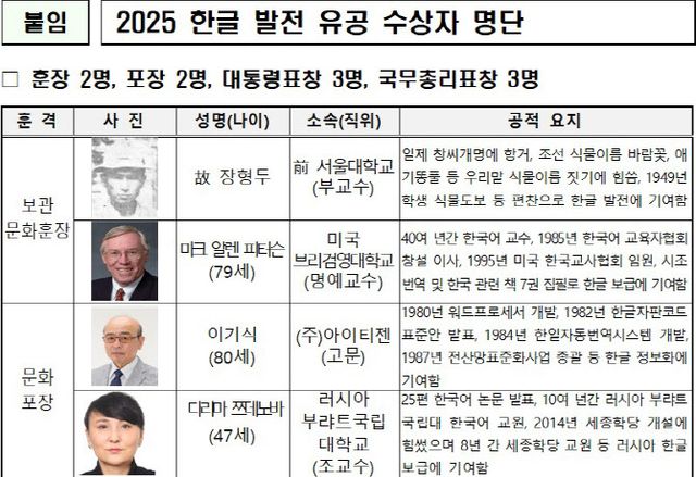 ◇대통령 표창은 △한글 서체 개발과 제자 양성으로 한글 예술을 전승해온 조종숙 동방문화대학원대학교 석좌교수 △특수교육 교사로서 특수교육 한글 교수법을 연구하고 이를 현장에 적용해온 신은경 서귀포온성학교 교사 △동티모르에서 13년 이상 한국어 교육·확산 기반을 다진 최창원 고려대학교 아세아문제연구원 연구위원에게 수여한다.