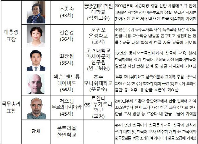 ◇국무총리 표창은 △호주에서 한국어 교과목 증설, 석박사 과정 신설 등을 통해 한글과 한국어 보급에 기여한 잭슨 앤드류데이비드 호주 모나쉬대학교 교수 △르완다에서 현지 한국어 교사 양성 등 한국어 보급의 토대를 다진 저스틴 무르와나시야카 르완다 지에스(GS) 부가루라 학교 교장 △캐나다에서 46여 년간 한국어 보급에 기여한 몬트리올 한인 학교가 받는다.