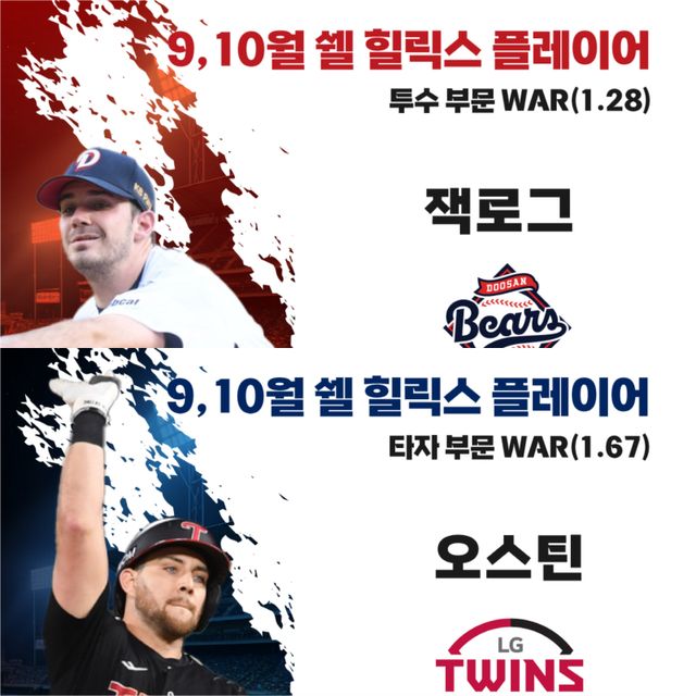 9-10월 월간 ‘쉘힐릭스플레이어’로 선정된 두산 잭로그와 LG 오스틴에게는 한국쉘의 후원으로 시상금 100만 원이 지급된다.
