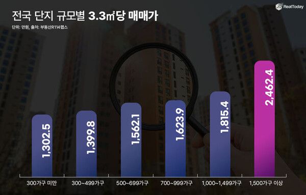 9일 부동산R114랩스 자료에 따르면 올해 상반기 전국 단지 규모별 3.3㎡당 매매가는 ▲300가구 미만 1302만5000원 ▲300~499가구 1399만8000원 ▲500~699가구 1562만1000원 ▲700~999가구 1623만9000원 ▲1000~1499가구 1815만4000원 ▲1500가구 이상 2462만4000원으로, 단지 규모가 클수록 평당 매매가도 높게 형성되고 있다.
