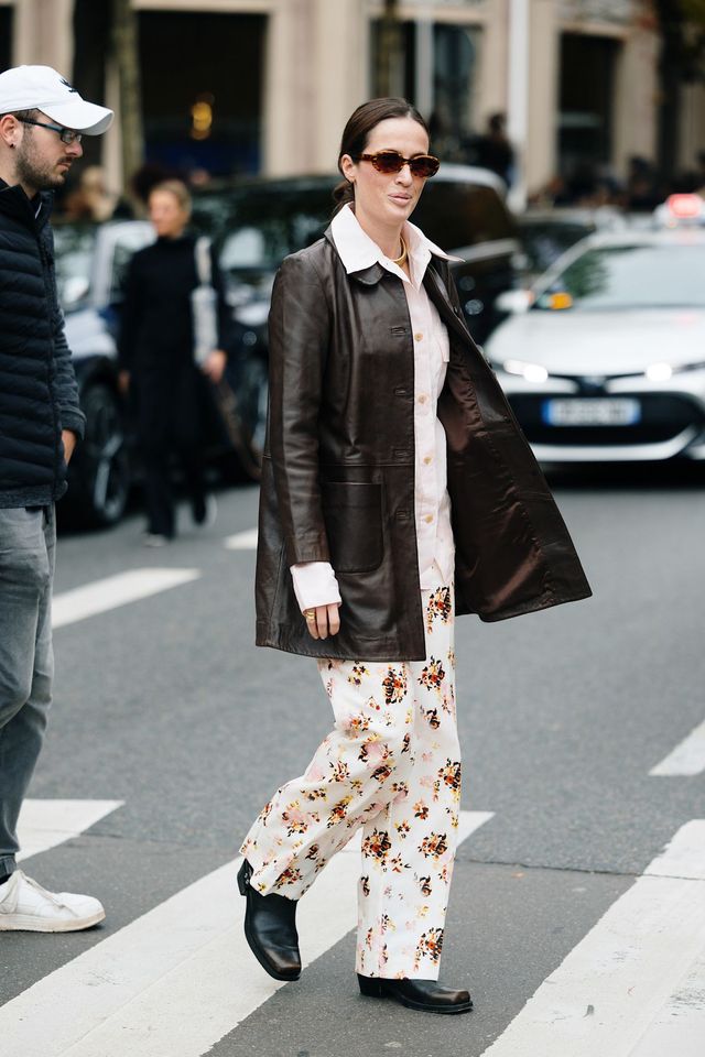 엉덩이를 덮는 긴 길이에 박시하고 미니멀한 실루엣의 레더 코트도 이 가을 유용한 아이템입니다. 게다가 은은한 광택의 초콜릿 브라운 코트는 베이직한 청바지 스타일도 좋지만, 의외로 파자마 무드 같은 편안한 룩과도 의의로 잘 어울려요. 화사한 플라워 패턴, 핑크 셔츠와의 조합이 바로 그 증거죠. 악세서리로는 단정한 로퍼와 미니멀한 선글라스로 선택해 ‘낭만적인 게으름’을 마음껏 즐겨봐도 좋겠습니다.