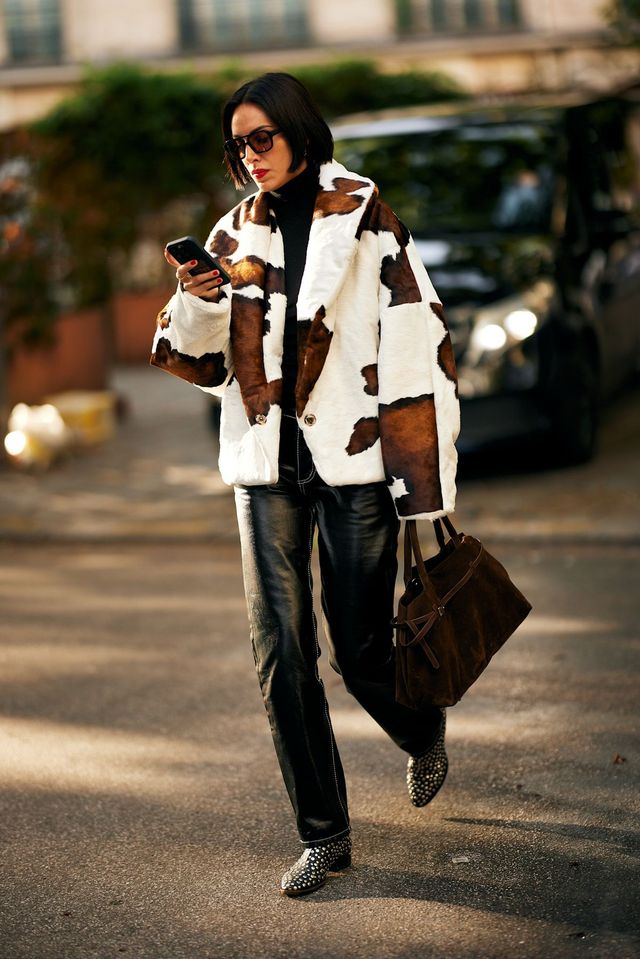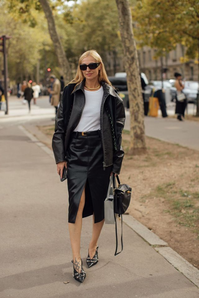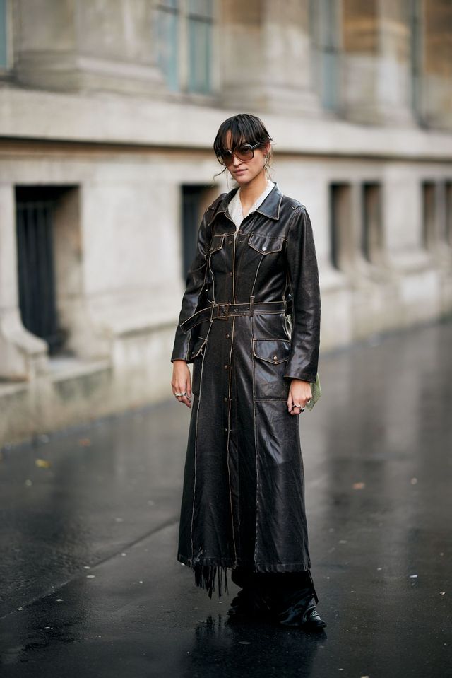 오버사이즈 가죽 자켓을 하의 실종 같은 미니 드레스처럼 연출한 스타일도 눈에 띄었습니다. 이때 허리 아래쪽의 벨트를 살짝 조여 여성스러움을 끌어올리는 게 포인트죠. 마이크로 미니스커트 같은 짧은 길이와 시스루 블랙 스타킹, 매혹적인 힐과의 조화는 패션위크 스트리트의 펑키한 히로인이 되기에 충분해요. 가죽 장갑까지 함께 착용한다면 더욱 극적인 레더 룩을 완성할 수 있고요.
