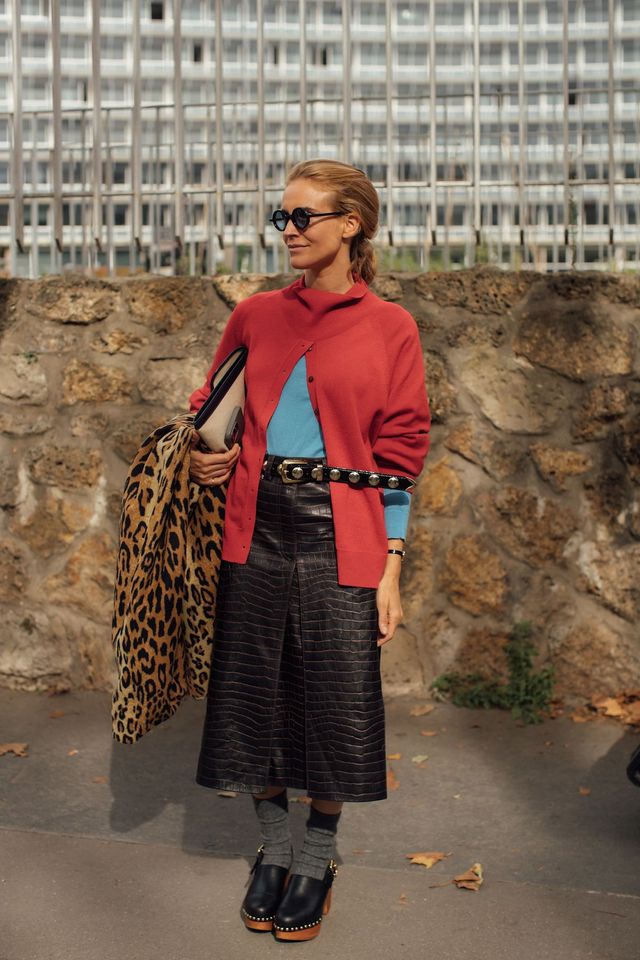 레더 스커트의 모습도 변화무쌍합니다. 크록 텍스처의 A 라인 레더 스커트는 비비드 레드, 블루 니트 상의와 레오퍼드 코트를 과감하게 섞어 아티스틱한 조합을 만들어낼 수 있어요. 강한 색과 질감이 부딪히는 듯하지만, 오히려 그 불협화음이 자유로움을 만들죠. 슬릿 장식이 들어간 레더 미디스커트에 화이트 티셔츠 룩도 좋습니다. 여기에 레더 재킷까지 더하면 미니멀하게 정리한 모던 룩이 돼요. 딱 필요한 만큼만 힘을 준 센스가 돋보이죠. 과감하든 담백하든, 확실한 나만의 추구미를 보여주기 딱 좋은 게 바로 레더 스커트에요.