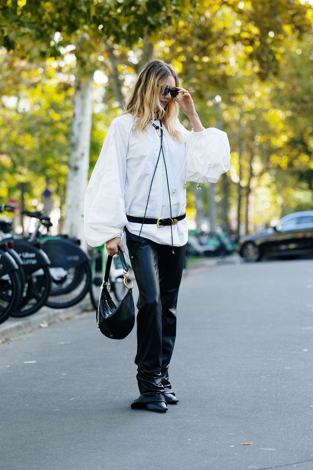 레더 팬츠와 함께라면 어떤 상의와 입더라도 강렬한 무드를 연출할 수 있어요. 카우하이드 패턴의 페이크 퍼 자켓과 연출하면 럭셔리 웨스턴 무드가 되는 식이죠. 묵직한 브라운 백과 볼드한 부츠까지 더하면 도심 속 카우 걸이 되는 건 한순간입니다. 살짝 여성스러운 무드와의 믹스 매치도 가능하고요. 풍성한 소매의 볼륨감 넘치는 흰 셔츠 위에 놓인 벨트는 클래식과 록시크의 경계를 흥미롭게 그려내죠.