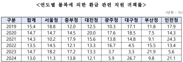 특히 2024년에는 대구지방국세청의 직원 귀책률이 26.7%로 전국에서 가장 높았으며 인천청 역시 21.1%를 기록해 전국 평균 13.0%를 크게 웃돌았다.