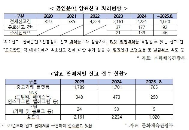 국회 문화체육관광위원회 박수현 의원(더불어민주당/충남 공주·부여·청양)이 문화체육관광부로부터 제출받은 ‘공연 분야 암표신고 현황(2020년~2025년 8월)’자료에 따르면, 2020년 359건에 불과하던 신고 건수는 2022년 4,224건으로 10배 이상 폭증했다. 2023년과 2024년에는 각각 2,161건, 2,224건으로 코로나 시기 대비 급증세를 이어갔다. 올해는 8월까지 접수된 전체 신고 건수가 1,020건에 달했다.