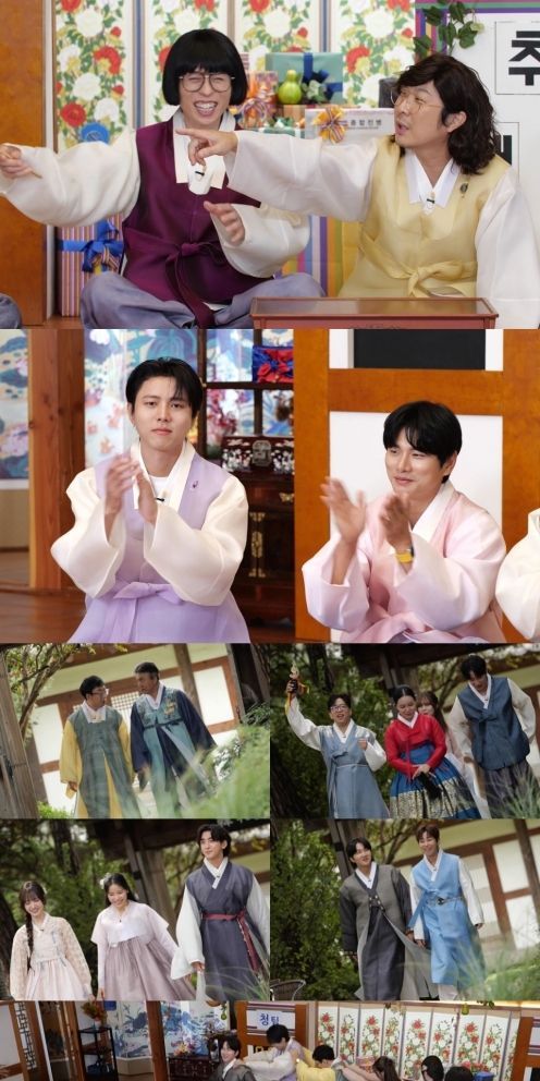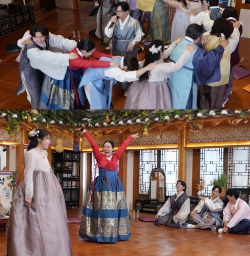 공개된 사진 속에는 한복을 곱게 차려입고 추석 대잔치를 즐기는 참가자들의 모습이 담겨 있다. 대상 트로피를 번쩍 들고 입장하는 이적부터 학춤을 추는 은상 수상자 랄랄, 다 함께 기차놀이 중인 참가자들의 모습까지, 마치 친척들이 한자리에 모인 명절 분위기를 자아낸다.
