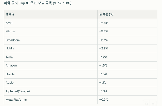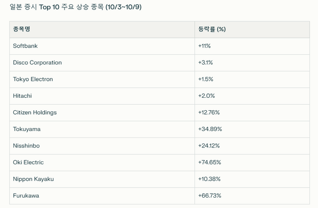 2025년 10월 3일부터 9일까지 미국·일본 증시에서 두드러지게 상승한 주요 종목 Top 10의 현황은 다음과 같습니다.