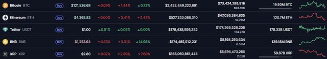 글로벌 가상자산 시황중계 사이트 코인마켓캡에 따르면 10일 오전 8시 25분 기준 비트코인 가격은 24시간 전 대비 1.44% 하락한 12만 1536달러를 기록했다. 일주일 전과 비교하면 0.72% 올랐다. 같은 시간 이더리움은 전일 대비 3.41% 하락한 4368달러에 거래됐다.