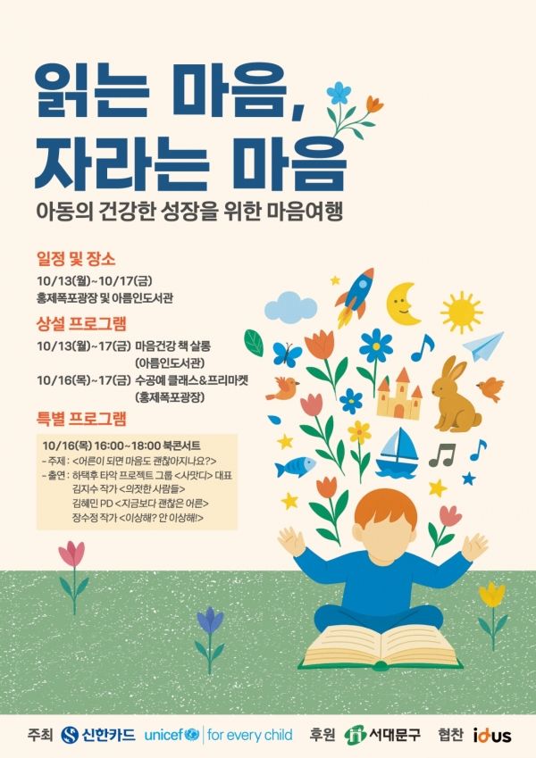 오는 13일부터 17일까지 5일간 서울 서대문구 홍제폭포 광장 및 아름인도서관 인근에서 진행되는 이번 행사에는 마음건강 문해력 증진을 위한 다양한 프로그램이 준비된다. 홍제폭포는 유니세프 아동친화도시 서대문구의 주요 명소로, 신한카드의 대표 사회공헌 프로젝트인 아름인도서관 513호 ‘폭포 책방’이 자리한 곳이다.
