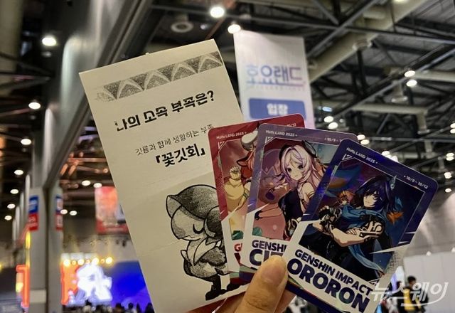 원신 부스에서는 ▲부족 테스트 ▲파도수련 ▲명중수련 등 총 3가지 체험에 참여할 수 있었다. 기자는 온라인상에서 유행하는 성향 테스트와 비슷한 기반으로 이뤄진 첫 번째 수련을 통해 깃룡과 함께 생활하는 부족인 '꽃깃회'를 배정받았다. 이후 나머지 2개의 수련도 참여해 원신 캐릭터 포토카드 3종을 모두 얻을 수 있었다.