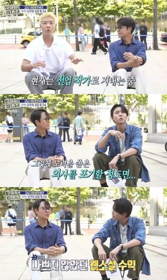 작가와 의사 활동 때의 수입 차이를 묻는 말에는 "조금 차이가 난다. 그런데 저는 의사로 활동한 것이 레지던트, 군의관, 페이닥터로만 일을 해봤었다"고 고백했다.