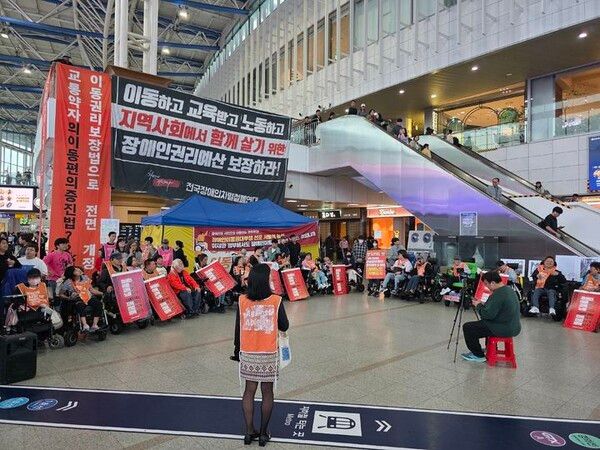 장애인단체가 서울역 대합실에서 교통약자이동편의법(교통약자법) 전면 개정을 촉구하며 연휴 내내 이어온 농성을 9일째 이어갔다.