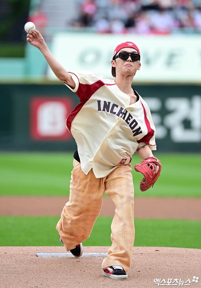 최현욱은 지난 9일 오후 인천SSG랜더스필드에서 열린 '2025 신한 SOL Bank KBO 포스트시즌' 삼성 라이온즈와 SSG 랜더스의 준플레이오프 1차전 경기에 앞서 승리 기원 시구에 나섰다. 시타는 SSG 어린이 팬이 맡았다.