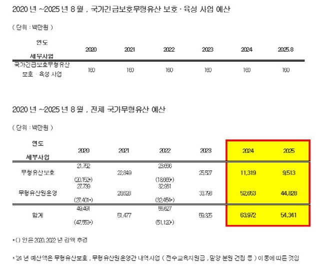 전승 인력은 줄고 있지만, 관련 예산은 제자리이거나 감소했다. 국가무형유산 전체 예산은 2024년 총 639억원까지 확대됐지만, 2025년에는 되레 90억원 이상 감소해 K-컬처의 성장세와는 반대 흐름을 보이고 있다. 국가긴급보호무형유산 보호·육성 예산도 5년째 연 1억6000만원에 머물러 있는 상황이다.