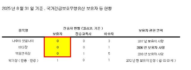 민형배 의원실에 따르면 현재 전승 취약종목은 25개로, 이 중 23개 종목은 5년 이상 취약 상태가 지속되고 있다. 이 가운데 소멸 위험에 처한 무형유산을 긴급히 보전하기 위해 지정한 ‘국가긴급보호무형유산’ 4종목(나주의 샛골나이, 바디장, 백동연죽장, 악기장) 중 ‘나주의 샛골나이’, ‘바디장’, ‘백동연죽장’은 현재 보유자 공백 상태로 이수자 확보조차 어려운 실정이다. 특히 ‘바디장’의 경우 보유자가 사망한 지 20년이 지났지만, 여전히 보유자를 지정하지 못한 것으로 나타났다.
