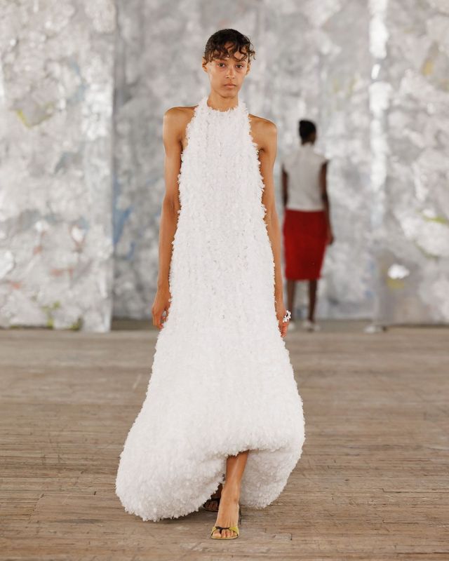뉴욕을 무대로 첫 런웨이를 연 디오티마는 디자이너 레이첼 스콧이 이끄는 브랜드예요. 스콧은 자메이카 디아스포라의 감성, 카니발의 색채와 리듬을 디자인 언어로 풀어내는 인물로 알려져 있죠. 이번 26SS 쇼는 그의 정체성을 정교하게 시각화한 무대였습니다. 강렬한 컬러와 볼륨, 크로셰 텍스처가 어우러진 룩들은 축제의 생동감과 우아한 구조미를 동시에 담아냈어요.