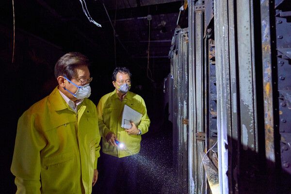 이 대통령은 시찰 과정에서 제일 먼저 화재 구역의 배터리가 보관된 냉각 침수조를 살핀 뒤 실제 화재가 발생한 5층 전산실을 찾아 피해 상황을 점검했다. 발화 원인과 배터리 적재 방식에 문제가 없었는지 등을 현장 관계자들에게 확인한 것으로 전해졌다.