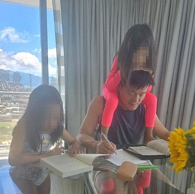 박진영은 성경책과 노트를 펴두고 필사에 집중하고 있다. 그의 어깨 위에는 둘째 딸이 앉아 아빠의 머리 위로 장난스럽게 팔을 두르고 있고, 옆에서는 첫째 딸이 책을 읽으며 조용히 시간을 보내고 있다. 밝은 햇살이 비치는 창가와 유리 너머로 펼쳐진 푸른 하늘이 어우러지며, 가족의 평화로운 분위기를 고스란히 전한다.