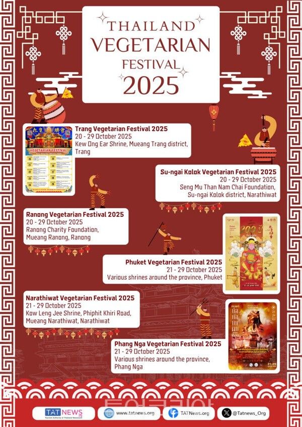 올해 지역별 축제 기간은 ▲방콕 10월 20-29일 ▲푸켓 10월 21-29일 ▲ Muang Thong Thani(논타부리) 10월 20-29일 ▲싸뭇사컨 10월 20-29일 ▲나컨빠톰 10월 20-30일 ▲뜨랑 10월 20-29일 ▲팡아 10월 21-29일 등이다.