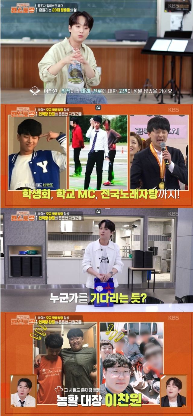 10일 방송된 KBS2 ‘신상출시 편스토랑’(이하 ‘편스토랑’)에서는 이찬원이 모교 영남대학교를 찾아 후배들을 위해 250인분의 아침밥을 준비하는 모습이 그려졌다.