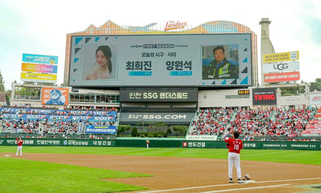 프로야구 PS는 2023년 한국시리즈 1차전부터 25경기 연속 매진 행진을 이어갔다. 경기는 4회 초가 진행 중이다. SSG가 2회 말 고명준의 홈런, 3회 말 최정의 적시타로 2-0 리드를 잡고 있다.