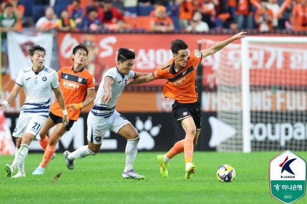 충북청주가 날카로운 역습을 전개했다. 전반 8분 후방에서 날아온 롱패스를 받은 이강한이 왼쪽에서 올린 낮은 크로스를 김준영이 걷어내려던 게 잘못 맞아 오른쪽 골대를 맞고 나왔다.