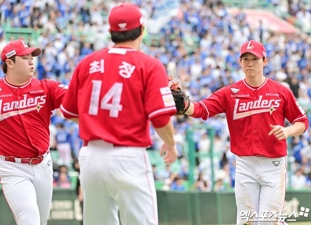 박성한은 두 팀이 2-2로 맞선 4회초 2사 1, 2루에서 호수비로 실점을 막았다. 강민호의 땅볼 타구를 몸을 날려 잡아낸 뒤, 1루가 아닌 3루로 송구해 2루주자 르윈 디아즈를 포스아웃 처리했다. 판단력과 순발력이 돋보인 장면이었다.