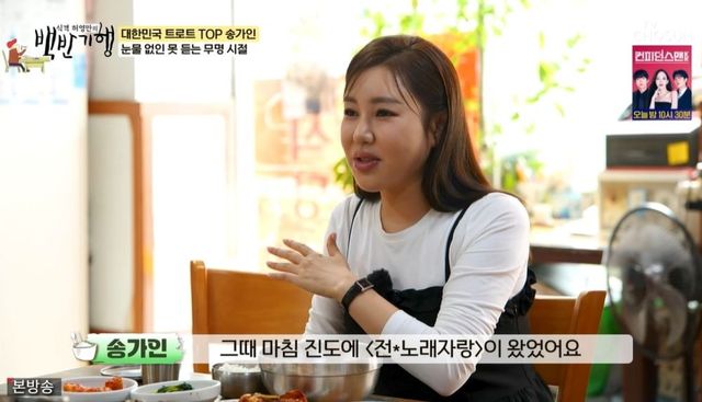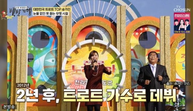 송가인은 트로트로 전향한 이유에 관해 “그때 마침 진도에 ‘전국노래자랑’이 왔다. 나갔는데 1등을 하고, 그 길로 가게 됐다”라고 했다. 데뷔 후 7~8년간 무명 생활을 했다는 송가인은 데뷔 초 한 달에 스케줄이 3~4건이 전부였다고.