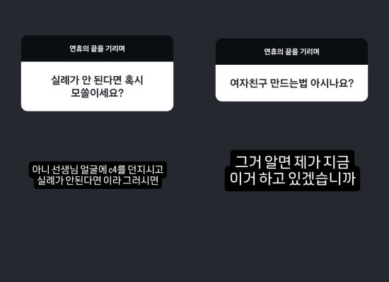 또 "여자친구 만드는 법 아시나요?"라는 물음에는 "그거 알면 제가 지금 이거 하고 있겠습니까"라고 정색했다.
