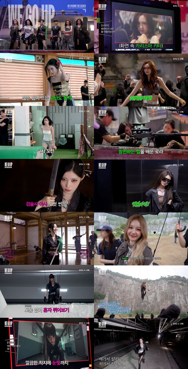 미니 2집 타이틀곡 ‘WE GO UP’ 뮤직비디오는 각기 다른 빌런을 마주한 여전사 콘셉트로 제작됐다. 안무 중심의 기존 영상과 달리 액션 연기에 중점을 둔 만큼, 멤버들은 완성도 높은 컷을 위해 액션 스쿨에서 고난도 훈련을 받으며 구슬땀을 흘렸다.