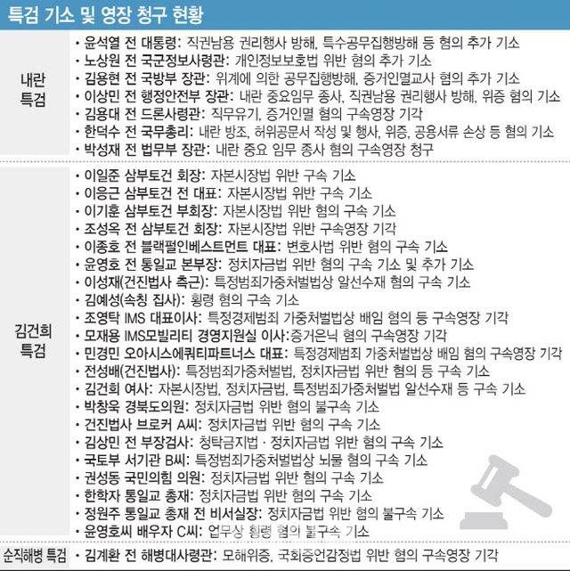 특히 지난 10일 특검은 통일교 부정청탁과 관련해 한학자 통일교 총재와 정원주 전 총재 비서실장을 기소했다. 구속 기소된 윤영호 전 세계본부장은 업무상 횡령 등 혐의로 추가 기소됐다. 통일교 측에 불법 정치자금 1억원을 수수한 혐의를 받는 권성동 국민의힘 의원도 특검의 수사망을 피하지 못했다. 이밖에 국회의원 공천 청탁과 관련 김상민 전 부장검사 역시 구속됐다.