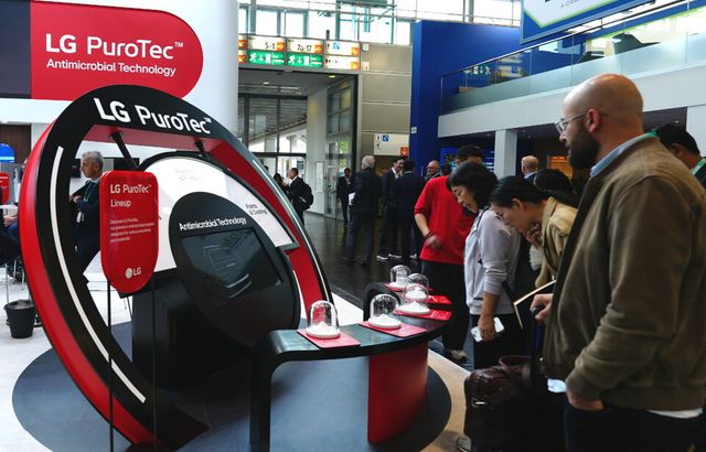 LG전자는 전시관에 세탁기·냉장고 등 가전을 비롯해 의류, 소파, 욕실 용품, 자동차 시트 등 퓨로텍을 적용한 다양한 제품을 전시하고, LG화학과 협업해 개발한 항균 플라스틱도 함께 선보여 LG전자의 기술 경쟁력을 강조했다.