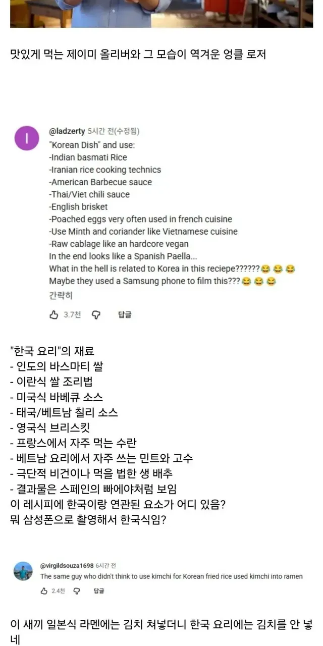 [스압] 한국식 볶음밥을 만들었다가 욕 쳐먹고 있는 제이미 올리버,,
