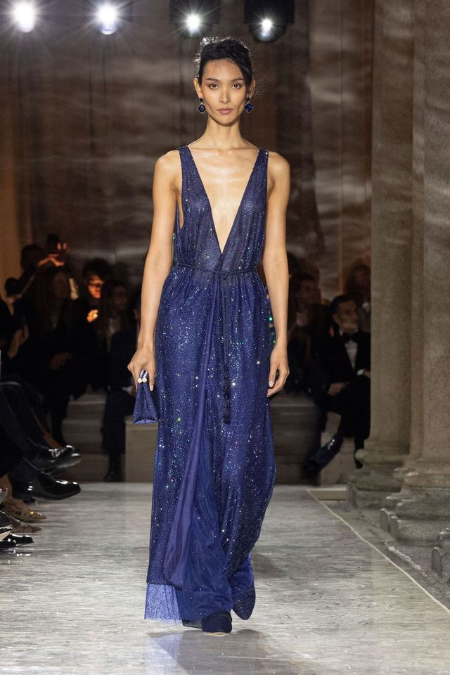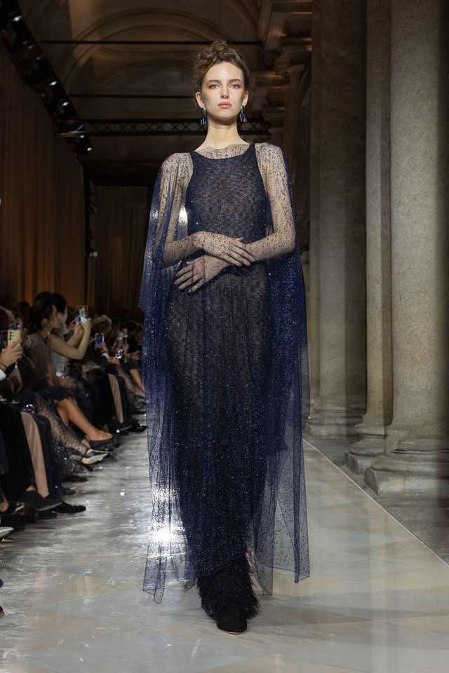이번 컬렉션은 밀라노의 도시적 리듬과 지중해의 섬 판텔레리아의 풍경을 오가며 구성됐습니다. 유럽과 아프리카의 경계에 위치한 판텔레리아는 이국적인 매력과 야생의 자연을 품은 지역으로 아르마니의 감성에 깊은 영향을 줬다고 합니다. 이 대비적인 풍광의 이미지 속에서 컬렉션은 도시와 자연, 구조와 자유, 질서와 감정의 균형을 탐구했습니다. 룩의 요소들은 마치 섬의 바람에 흔들릴 듯 가볍고 유동적으로 보였죠. 특히 고급스러운 테일러링과 가벼운 질감의 드레스는 긴 실루엣이 강조됐고, 흐르는 듯한 패브릭의 움직임이 우아함을 극대화했는데요 각각의 룩은 단 하나의 제스처만으로도 ‘무게감 없는 옷이 가장 강력한 메시지를 전한다’는 그의 철학을 구현했습니다.