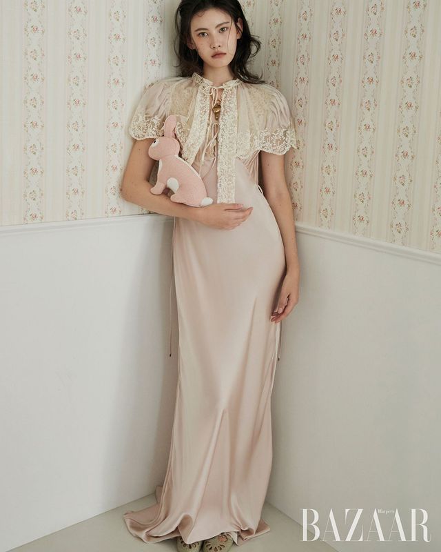 레이스 트리밍이 돋보이는 케이프, 드레스, 목걸이, 슈즈는 모두 Chloé. 토끼 인형은 Hermès.