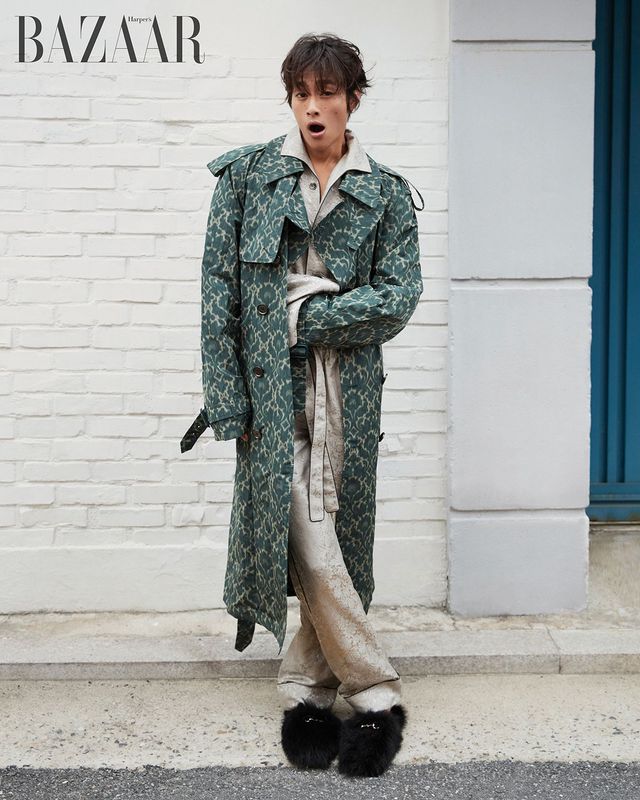 트렌치코트, 실크 파자마 셔츠, 트라우저는 모두 Burberry. 퍼 슬라이드는 Gucci.