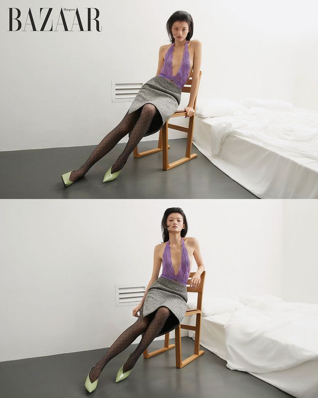 레이스 홀터넥 보디수트, 스커트, 타이츠, 뮬 힐은 모두 Gucci. 의자는 Hermès.