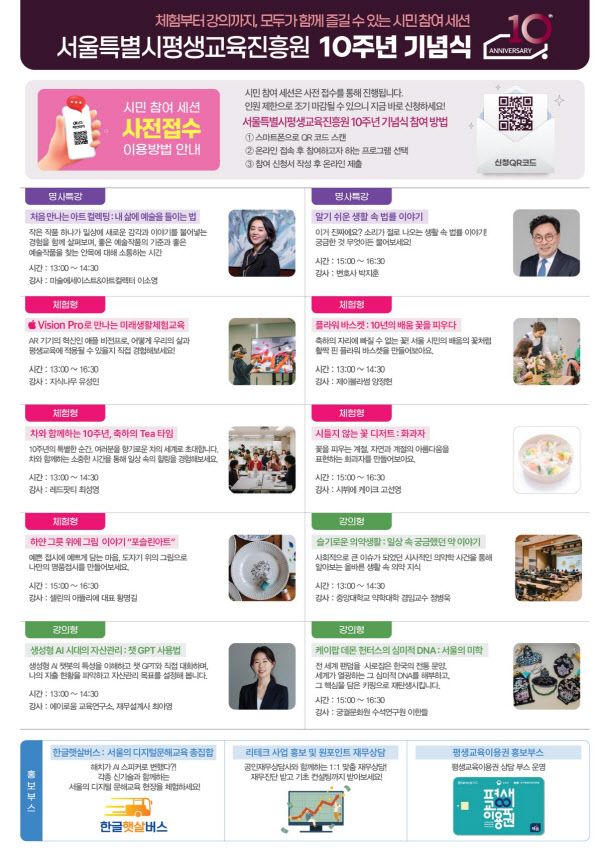 기념식은 이날부터 ‘10주년 기념식 공식 홈페이지’에서 사전 신청할 수 있다. 기념식과 평생학습포럼, 시민 참여 세션은 각각 신청할 수 있으며, 선착순 300명을 모집한다. △한글햇살버스 △리테크 중장년 원포인트 재무상담 △평생교육이용권 홍보 부스는 별도 신청 없이 현장에서 참여할 수 있다.