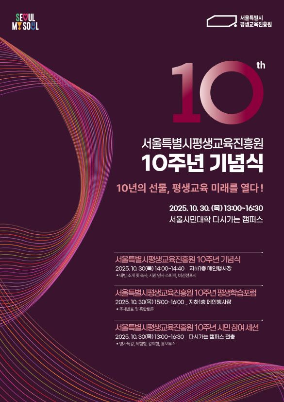 한용진 서울시평생교육진흥원장은 “이번 10주년 기념식이 시민과 함께 미래 평생학습의 비전을 열어가는 중요한 계기가 될 것”이라며 “많은 시민이 참여해 지난 10년간 서울 평생교육의 성과를 함께 즐기고, 앞으로 10년의 출발선에 함께 서 주시기를 바란다”고 전했다.