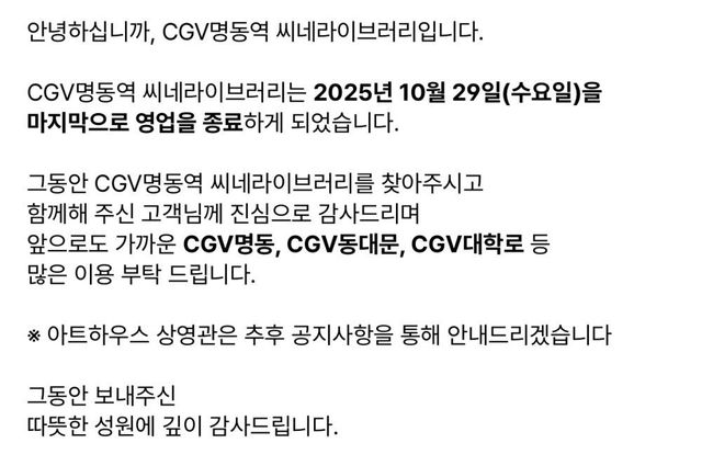 CGV는 13일 공식 홈페이지를 통해 “CGV명동역 씨네라이브러리는 2025년 10월 29일 수요일을 마지막으로 영업을 종료하게 됐다”고 밝혔다.
