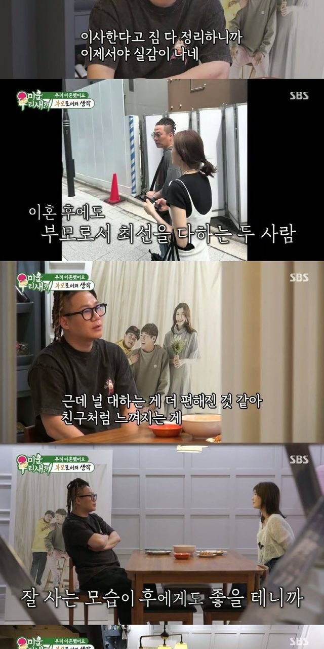 이어 두 사람은 식사하며 다가올 이별을 앞두고 솔직한 대화를 나눴다. 서로의 앞날과 아들 윤후에 대한 의논도 함께 나누었다. 이 모습에 윤민수의 모친은 “그냥 저렇게 살면 안되겠느냐”고 안타까워했다. 신동엽은 “이혼했지만 사이좋은 부부도 꽤 많다. 서로 헐뜯는 모습보다 자녀에게도 훨씬 좋은 모습일 것”이라며 두 사람의 모습을 존중했다. 또한 윤민수와 전 아내는 “이혼은 했지만 20년을 함께해왔으니 가족”이라며 서로 어려운 일이 있으면 연락하자며 서로를 향해 진심 어린 응원을 전했다.