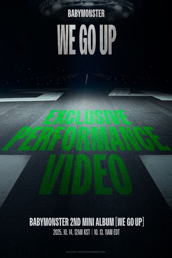 이날 업로드된 'WE GO UP' EXCLUSIVE PERFORMANCE VIDEO D-1' 포스터도 음악 팬들의 기대감을 수직 상승시킨다. 어두운 밤 어둠이 깔린 광활한 활주로, 그 위를 비추는 조명이 압도적 스케일을 통해 최초로 베일을 벗을 베이비몬스터의 'WE GO UP' 퍼포먼스를 예감케 한다.